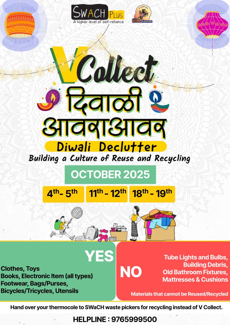 V Collect is a special service offered by SWaCH Pune, India’s largest waste picker cooperative, in partnership with the Pune Municipal Corporation. We offer citizens a preferred and responsible way to dispose of items that can’t go into your regular garbage but still have immense potential for reuse.